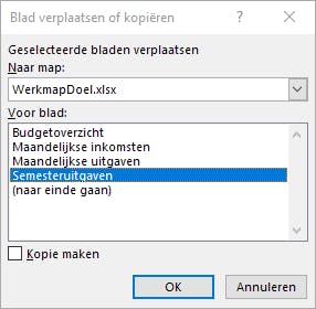 We hebben het tot nu toe gehad over het verplaatsen en kopiëren van werkbladen binnen dezelfde werkmap. Maar je kunt een werkblad ook naar een andere werkmap verplaatsen. Zorg ervoor dat beide werkmappen open zijn. Voor de duidelijkheid noemen we de werkmap waarvan we een werkblad willen kopiëren WerkmapBron.xlsx. De werkmap waar het werkblad in willen plakken, noemen we WerkmapDoel.xlsx. Klik in WerkmapBron.xlsx met de rechtermuisknop op de bladtab die je wilt kopiëren en kies de opdracht Verplaatsen of kopiëren. Er zal een klein venstertje openen, waar je in het vak Naar map de optie WerkmapDoel.xlsx selecteert. Onder Voor blad bepaal je op welke positie dat werkblad moet komen te staan. En onderaan kun je aangeven of Excel een kopie van het geselecteerde werkblad moet maken. Vink je dat niet aan, dan zal Excel het werkblad niet kopiëren, maar van de ene naar de andere map verplaatsen.