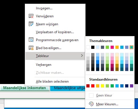 Om het overzichtelijk te houden, kun je de tabbladen niet alleen van een geschikte naam maar ook van een kleurtje voorzien. Klik met de rechtermuisknop op de tab van het werkblad en selecteer de optie Tabkleur. Hierdoor opent het palet met de themakleuren en de standaardkleuren. Met de optie Meer kleuren opent de kleurenkiezer van Windows waar in je iedere mogelijke kleur kunt selecteren. Als de bladtab een licht kleurverloop naar de betreffende kleur heeft, betekent dat dat het werkblad geselecteerd is. Klik op een tab van een ander werkblad om de daadwerkelijke kleurverandering te zien.