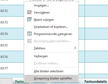 Je kunt aanpassingen op verschillende werkbladen tegelijk toepassen door ze tijdelijk te groeperen. Om de werkbladen te groeperen, druk je de Ctrl-toets in terwijl je één voor één op de verschillende bladtabs klikt. Wanneer je daarna in één blad van de groep de gegevens van cellen opmaakt in een bepaalde kleur of lettertype, zullen dezelfde cellen in de overige gegroepeerde werkbladen dezelfde opmaak overnemen. Ook kun je gegevens op dat ene tabblad typen waarna diezelfde gegevens ook op de andere tabbladen zullen verschijnen. Vergeet de groepering niet op te heffen, anders zul je, zonder dat je er erg in hebt, gegevens blijven aanpassen op alle gegroepeerde werkbladen. Om de groepering op te heffen, klik je met de rechtermuisknop op een van de tabs en kies je voor Groepering bladen opheffen.