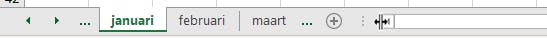 In Windows zit onder aan in het Excel-venster een schuifbalk die nogal wat plaats inneemt. Als je met veel werkbladen werkt, kom je daardoor ruimte tekort om alle bladtabs te zien. Dan is het fijn om te weten dat je de tabblad-balk langer kunt maken. Klik daarvoor met je muisaanwijzer op de drie verticale stippen links van de schuifbalk. Sleep vervolgens de drie stippen naar rechts om de schuifbalk in te korten.