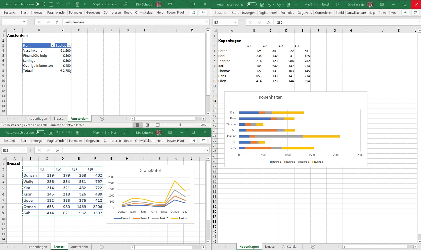 Wanneer je met meerdere werkbladen werkt, zie je normaal gesproken slechts één werkblad op het scherm. Maar met een eenvoudig trucje is het mogelijk om meerdere werkbladen tegelijk in beeld te hebben. We tonen dit met de werkbladen: Kopenhagen, Brussel, Amsterdam. Zorg dat het eerste werkblad (Kopenhagen) in beeld is en ga via het lint naar het tabblad Beeld. Klik in dit tabblad op de knop Nieuw venster. Hierdoor zie je hetzelfde werkblad in een tweede venster. In dat tweede venster klik je op de bladtab Brussel, zodat die in beeld komt. Omdat je nog een derde werkblad wilt weergeven, gebruik je de knop Nieuw venster nog een keer. En in dit derde venster klik je op de bladtab Amsterdam. Het derde venster is herkenbaar aan de aanduiding 3 achter de bestandsnaam in de titelbalk. Nu kun je de drie openstaande vensters combineren door via het lint in het tabblad Beeld op de knop Alle vensters te klikken. Er verschijnt een klein dialoogvenster dat vraagt hoe je de vensters wilt combineren. Kies Naast elkaar en bevestig met OK. Alle openstaande vensters worden nu netjes naast en onder elkaar gerangschikt.
