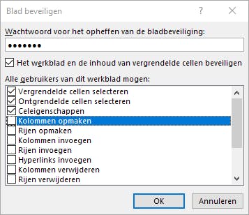 Een werkblad beveilig je om te voorkomen dat jij zelf of iemand anders er per ongeluk wijzigingen in aanbrengt. Ga daarvoor in het lint naar het tabblad Controleren en kies in de groep Beveiligen voor Blad beveiligen. In het pop-upvenster geef je aan wat de gebruiker nog wel mag doen. Als de gebruiker er niets in mag doen, haal je alle vinkjes weg. Vul vervolgens een wachtwoord in om ervoor te zorgen dat de beveiliging niet zomaar kan worden opgeheven. Ter bevestiging zal Excel vragen om het wachtwoord te herhalen.