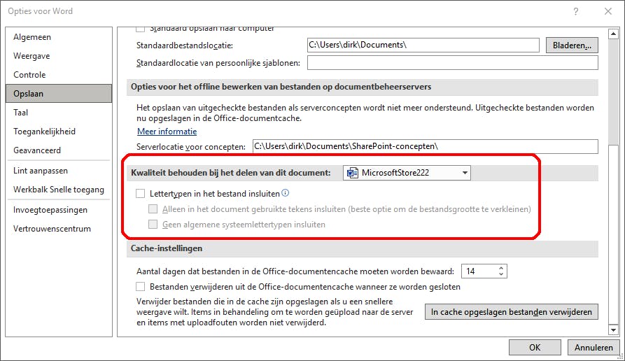 Soms gebruikt men ingebedde lettertypen, zodat anderen in staat zijn het document te lezen of af te drukken zoals de auteur het bedoelt. Ook hierdoor neemt de grootte van het bestand toe. Ga naar Bestand / Opties / Opslaan. Daar kun je de optie om de lettertypes in het bestand in te sluiten aan- en uitzetten.