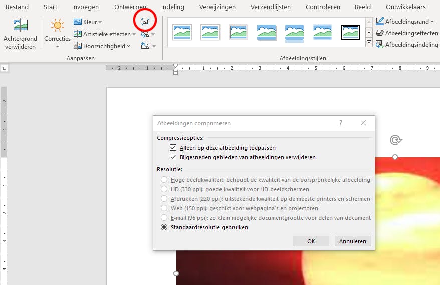 Comprimeer ook de afbeeldingen. Het tabblad Grafische indeling wordt pas beschikbaar zodra je een afbeelding selecteert. In de groep Aanpassen gebruik je de knop Afbeeldingen Comprimeren. Vink hier het vakje aan bij Bijgesneden delen van afbeeldingen verwijderen en zorg ook dat de optie Standaardresolutie gebruiken actief is. Hierdoor wordt overtollige ruimte verwijderd en ligt de resolutie vast voor alle afbeeldingen die je in het document gebruikt.