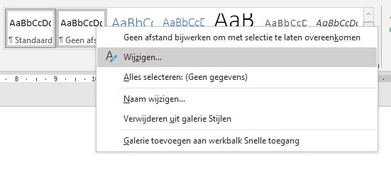 Hoe meer opmaak je handmatig toepast, hoe groter het document wordt. Daar is maar één remedie tegen: gebruik zoveel mogelijk stijlen. Niet alleen om de bestandsgrootte te beperken, maar ook om de opmaak te automatiseren. Om een stijl te gebruiken, selecteer je een tekst en daarna kies je een stijl in het tabblad Start. Om zo’n stijl aan te passen, klik je met de rechtermuisknop op een stijl en dan kies je de opdracht Wijzigen.