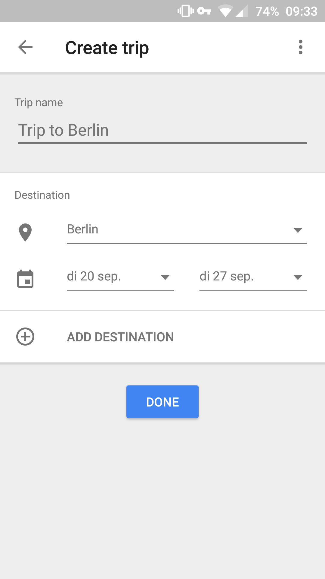 Zodra je de stad hebt gekozen die je gaat bezoeken, kun je beginnen met het plannen van je trip (en let ook even op het detail waarbij je de Fernsehturm in Berlijn kunt zien!). Je klinkt op 'Create trip', en vult daar de gegevens over je verblijf in. Via 'Add destination' kun je nieuwe steden toevoegen als je er meerdere op één vakantie bezoekt. Klik vervolgens op 'Done'.