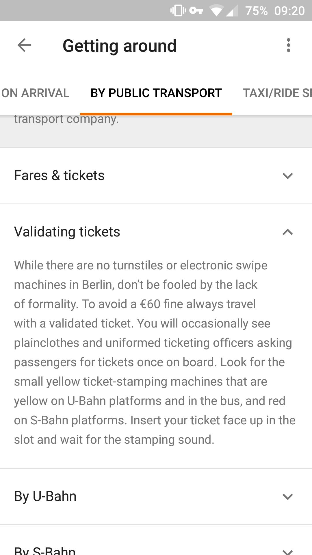 Vanuit het beginscherm kun je ook naar 'Getting around'. Daar zie je vooral veel informatie over het openbaar vervoer in de stad waar je bent, zoals wat je met treinkaartjes moet doen en wat die kosten (en wat de boete is als je ze vergeet te kopen). Je vindt er bovendien informatie over bustijden, over de kosten van taxi's, en wat je het beste kunt doen als je op het vliegveld landt.