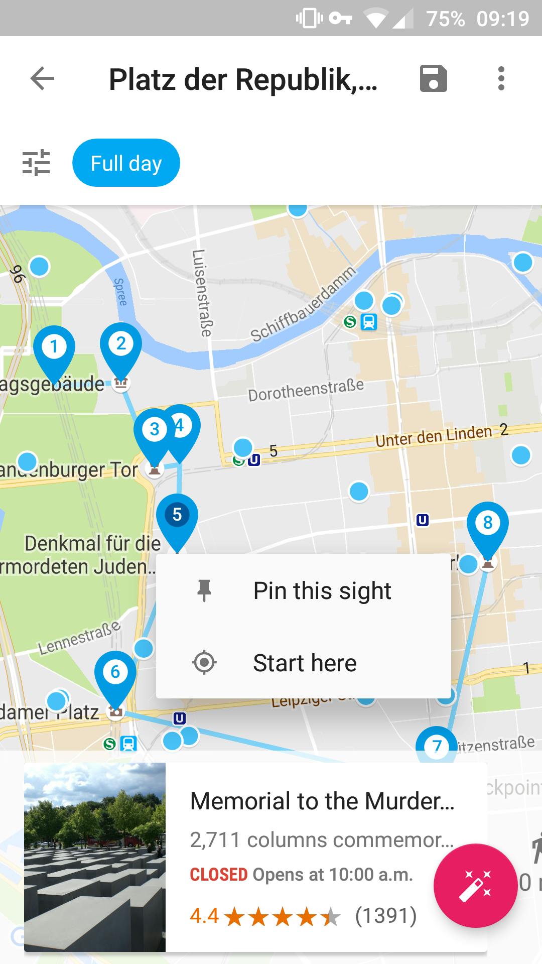 Door op één van de voorgestelde 'Day plans' te klikken, krijg je een kaart met alle bezienswaardigheden erop. Klik je daarop, dan krijg je ook hier informatie te zien over een attractie zoals de openingstijden en eerdere beoordelingen van anderen. Er staat daar bovendien een knop waarmee je de trip voor jezelf kunt aanvullen, als je bijvoorbeeld ergens wel of niet heel wil.