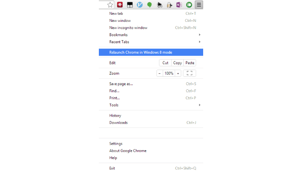 Om te beginnen moet Chrome je standaard browser zijn in Windows 8 of 8.1. De eenvoudigste manier om dit te doen is door op het menu icoon met de drie horizontale streepjes te klikken in Chrome op de desktop, en Relaunch Chrome in Windows 8 mode te selecteren.