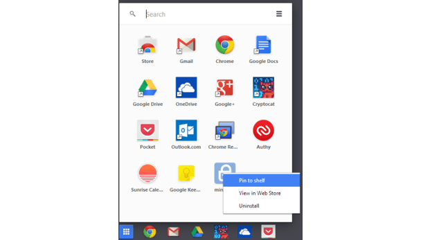 Om Chrome apps aan de shelf vast te pinnen voor snelle toegang, klik op het raster in de linkerhoek (de app launcher voor Chrome OS). Klik met de rechtermuisknop op een geïnstalleerde Chrome app en kies Pin to shelf. Je kunt apps ook naar de shelf slepen als je het liever op die manier doet.