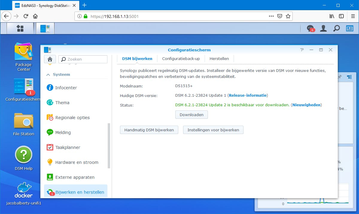 Voordat je begint met de installatie van Synology Office op de nas is het belangrijk de nas te configureren en controleren. Log in op de nas en kijk of er een update beschikbaar is voor de DSM-besturingssoftware via Start / Configuratiescherm / Bijwerken en herstellen. Is er een nieuwe versie, klik dan op Downloaden / Nu bijwerken. De nas zal de software updaten en rebooten. Log daarna opnieuw in en controleer of er nog meer updates zijn. Update daarna alle geïnstalleerde packages via Package Center / Geïnstalleerd / Alles bijwerken. Het kan ook geen kwaad packages die je niet meer gebruikt, uit te schakelen of te verwijderen. Klik daarvoor naast de naam van de package en kies in het keuzemenu voor Stop of Verwijderen.