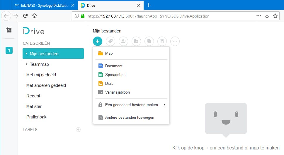 Om Synology Office te starten, open je het hoofdmenu van de nas en start je Drive. Drive opent in een nieuw tabblad van de browser. Hoewel Synology Office een echte concurrent voor Microsoft Office wil zijn, lijkt de manier waarop je het pakket gebruikt meer op Google Docs. Alle programma’s draaien in de browser en je begint niet met het opstarten van een tekstverwerker of rekenprogramma, maar je werkt vanuit de documenten. Drive is dan ook een soort Verkenner voor de documenten en mappen op de nas. In de linker kantlijn van Drive worden de belangrijkste onderdelen weergegeven. Van boven naar beneden zijn dat de toegang tot de map Mijn bestanden waarin de eigen documenten komen te staan, de Teammap waarin documenten van het team kunnen worden geplaats, en daaronder een aantal ‘zoekopdrachten’ zoals Met mij gedeeld, Met anderen gedeeld, Recent, Met ster en Prullenbak.