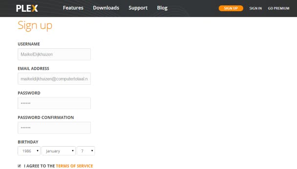 Nadat je Plex Media Server hebt opgestart, opent de gebruikersinterface in een browser. Aan het pictogram in het systeemvak merk je dat de software actief is. Voordat je de mediaserver gaat inrichten, heb je eerst een account nodig. Klik rechtsboven op SIGN UP en vul alle gevraagde velden in. Ga akkoord met de voorwaarden, waarna je bevestigt met SIGN UP. Je ontvangt nu een e-mail met een bevestigingslink. Klik op Confirm Registration om het account te bevestigen. Er opent een webpagina met het verzoek om een betaald account aan te schaffen, maar deze pagina kun je gewoon afsluiten.
