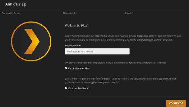 Zodra je een account hebt aangemaakt, ben je automatisch ingelogd bij Plex Media Server. Klik op AKKOORD om de algemene voorwaarden te accepteren. Er verschijnt vervolgens een Nederlandstalig stappenplan waarmee je simpel de mediaserver inricht. Geef de mediaserver een duidelijke naam. Deze naam verschijnt in beeld zodra je bijvoorbeeld met een smartphone, tablet of andere pc media wilt afspelen. Laat verder een vinkje staan voor Verbinden met Plex. Dankzij deze instelling lukt het om de mediabibliotheek vanaf buiten je thuisnetwerk te benaderen (als je dat tenminste wilt). Klik op VOLGENDE.