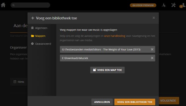 Alle mediabestanden die je aan Plex Media Server toevoegt, stream je eenvoudig naar andere apparaten. Je kunt in het programma meerdere bibliotheken aanmaken. Dat is bijvoorbeeld handig wanneer je televisieseries, films, eigen video-opnames, muziek en afbeeldingen gescheiden wilt houden. Klik op VOEG EEN BIBLIOTHEEK TOE en bepaal wat voor mediabestanden je wilt toevoegen. Geef de bibliotheek een naam en kies de gewenste taal. Via VOLGENDE wijs je met VOEG EEN MAP TOE de gewenste map(pen) aan. Klik als laatste op VOEG EEN BIBLIOTHEEK TOE / VOLGENDE.