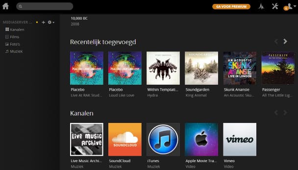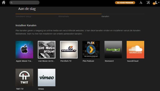 Je kunt ook online kanalen aan de mediaserver toevoegen. Hiermee heb je rechtstreeks toegang tot filmpjes en muziek afkomstig van bepaalde websites. Het programma biedt onder meer kanalen aan van SoundCloud en Vimeo. Verder is het mogelijk om filmtrailers uit de mediacatalogus van Apple te bekijken. Klik op een kanaal dat je interessant vindt en kies voor INSTALLEREN. Later voeg je optioneel nog meer kanalen toe, zoals Uitzending Gemist en YouTube. Via VOLGENDE / KLAAR rond je het stappenplan van Plex Media Server af. Je mediabibliotheek verschijnt nu op het scherm.