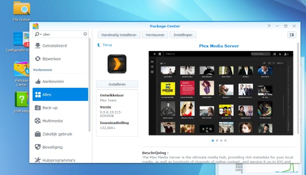 In plaats van op een pc kun je Plex Media Server ook op een NAS installeren. Een NAS verbruikt minder energie dan een computer. Bovendien hebben deze apparaatjes doorgaans veel opslagcapaciteit, waardoor ze prima geschikt zijn om als mediaserver te fungeren. Surf naar deze website en klik op NAS. Voor de meeste merken is er een installatiepakket beschikbaar. Dat werkt bij ieder type op een andere manier. Zo installeren bezitters van een Synology-NAS vanuit het onderdeel Package Center de software. Het programma werkt op een NAS exact hetzelfde als op een pc.