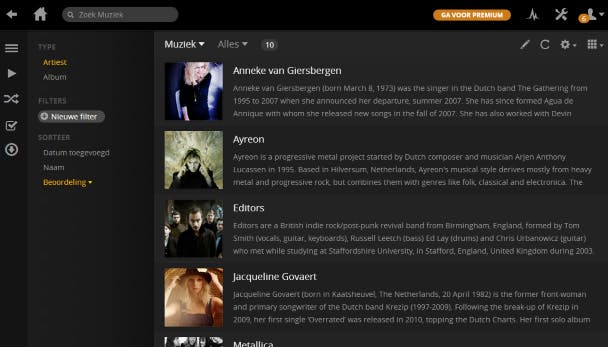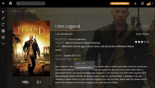 Een pluspunt is dat Plex Media Server mediagegevens ophaalt vanaf internet. Open een bibliotheek en klik op het hoesje van een film. Je ziet precies welke regisseur en acteurs er hebben bijgedragen. Verder lees je een korte samenvatting. Besluit je om naar de film te kijken, dan activeer je indien aanwezig alvast de Nederlandstalige ondertiteling. Tot slot pas je eventueel de beoordeling aan door op het gewenste aantal sterren te klikken. Naast filminformatie haalt het programma ook gegevens over artiesten op. Bij muziekalbums tref je bovendien een overzicht van alle liedjes aan.
