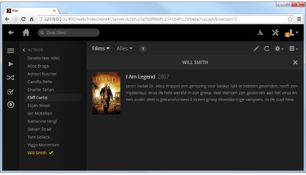 Zodra de gebruikersinterface van Plex Media Server opent, zie je welke bestanden er onlangs zijn toegevoegd. Aan de linkerkant bevinden zich alle bibliotheken. Klik op de naam van een bibliotheek om een overzicht van mediabestanden op te vragen. Een film of muziekalbum afspelen is heel eenvoudig. Zweef met de muis boven een film- of cd-hoesje en klik op het afspeelpictogram. Tijdens de filmweergave gebruik je rechtsboven het pictogram met de tekstballon om zo nodig Nederlandstalige ondertiteling in te schakelen.