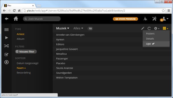 Standaard laat Plex hoesjes van alle films en muziekalbums zien. Als je meer titels binnen de gebruikersinterface wilt weergeven, is het slim om voor een andere weergave te kiezen. Open een bibliotheek en klik rechtsboven op het pictogram met negen kleine vierkantjes. Kies voor Details. Plex Media Server zet alle mediabestanden nu netjes onder elkaar voorzien van een kleine afbeelding en korte omschrijving. Wil je nog meer mediabestanden weergeven? Kies dan voor Lijst. In dat geval zijn in de bibliotheek uitsluitend de titels zichtbaar.