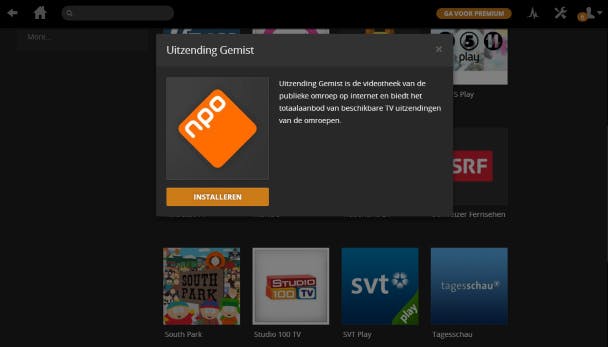 Wellicht heb je kort na de installatie van de software al enkele online kanalen toegevoegd. Dat is nog lang niet alles, want er zijn nog veel meer bronnen beschikbaar. Klik vanuit het hoofdvenster aan de linkerkant op Kanalen. Via INSTALLEER KANALEN verschijnt er een catalogus met nog meer bronnen. Kies voor Categories / TV en bekijk welke televisiestations je kunt toevoegen. Vooral Uitzending Gemist is een aanrader! Klik op een kanaal dat je leuk lijkt en bevestig daarna met INSTALLEREN. Andere bekende namen zijn NOS, YouTube en CNN.