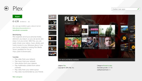 Vanaf de mediaserver stream je eenvoudig foto's, muziek en films naar een computer of tablet met Windows 10. De makers van Plex hebben voor dit besturingssysteem namelijk een eigen app ontwikkeld. Klik in het startscherm van Windows 10 op Store en zoek de app van Plex op. Het beste gebruik je hiervoor de zoekfunctie. Jammer genoeg is de toepassing niet gratis. Voor een bedrag van 4,99 euro is je volledige mediabibliotheek op de Windows 10-machine beschikbaar. Heb je geen zin om te betalen? In de volgende stap leggen we uit hoe je gratis mediabestanden naar andere pc's kunt streamen.
