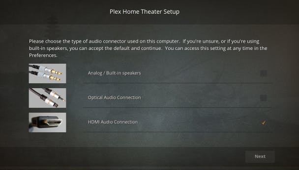 Zodra je Plex Home Theater voor de eerste keer opent, loodst een stappenplan je door het configuratieproces heen. Klik op Next en geef aan via welke kabel het geluidssysteem met je pc is verbonden. Er verschijnt een code op het scherm. Surf naar het aangegeven webadres en vul daar de code in. De pc is nu verbonden met de mediaserver van Plex. Bevestig met OK. Gebruik de pijltjestoetsen om door alle bibliotheken en kanalen te navigeren. Klik op het pijltje naar links en kies voor Preferences. Selecteer achter Language via Dutch de Nederlandse taal.