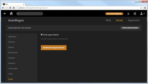 Plex Media Server ondersteunt de DLNA. Handig, want hierdoor is het mogelijk om mediabestanden ook naar apparaten te streamen waarvoor geen app beschikbaar is, bijvoorbeeld gameconsoles, smart-tv's en blu-ray-spelers. Surf naar deze website en klik rechtsboven op Instellingen. Navigeer achtereenvolgens naar Server / DLNA. Controleer of de optie DLNA ingeschakeld is aangevinkt. Bevestig zo nodig met BEWAAR WIJZIGINGEN. Je benadert de mediabibliotheek nu eenvoudig via andere apparaten. Op pc's is het programma Windows Media Player geschikt om de inhoud weer te geven. Met een smart-tv of blu-ray-speler kies je meestal het juiste kanaal om mediabestanden van netwerkbronnen te benaderen.