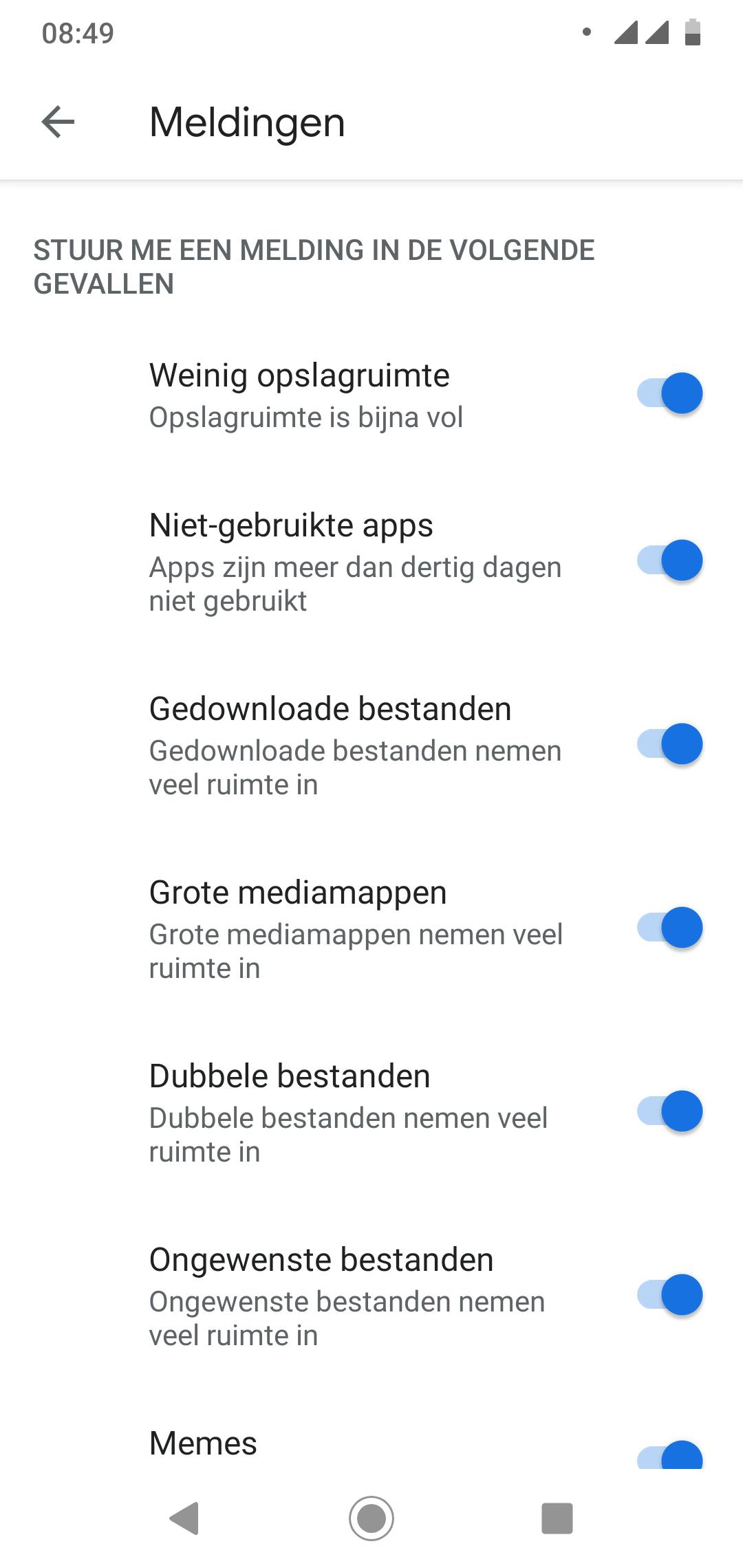 Eens in de zoveel tijd stuurt Android je een melding dat het ongebruikte of dubbele bestanden op je smartphone kan verwijderen. Je kunt op de melding tikken en bekijken om welke bestanden het precies gaat voordat je ze verwijdert. Wil je zelf een schoonmaakrondje doen, dan ga je naar Instellingen / Opslag. De app Files wordt geopend, hier zie je precies weergegeven hoeveel van je opslagruimte wordt ingenomen. Onderaan zie je zelfs precies wat voor soort bestanden het meeste ruimte opeisen. Tik op Ruimte vrijmaken om het automatische schoonmaakprogramma te starten. Allereerst zie je hoeveel ruimte wordt ingenomen door ongewenste bestanden. Dit zijn logbestanden en tijdelijke bestanden die apps hebben aangemaakt, zoals gebufferde YouTube-video’s en bekeken Instagram-foto’s. Tik op Bevestigen en vrijmaken. Om de specifieke bestanden in te zien, kun je nog even op Ongewenste bestanden zien tikken. Wil je ze meteen verwijderen, dan kies je voor Wissen. Een blauw scherm verschijnt en laat zien wanneer de bestanden allemaal verwijderd zijn.
