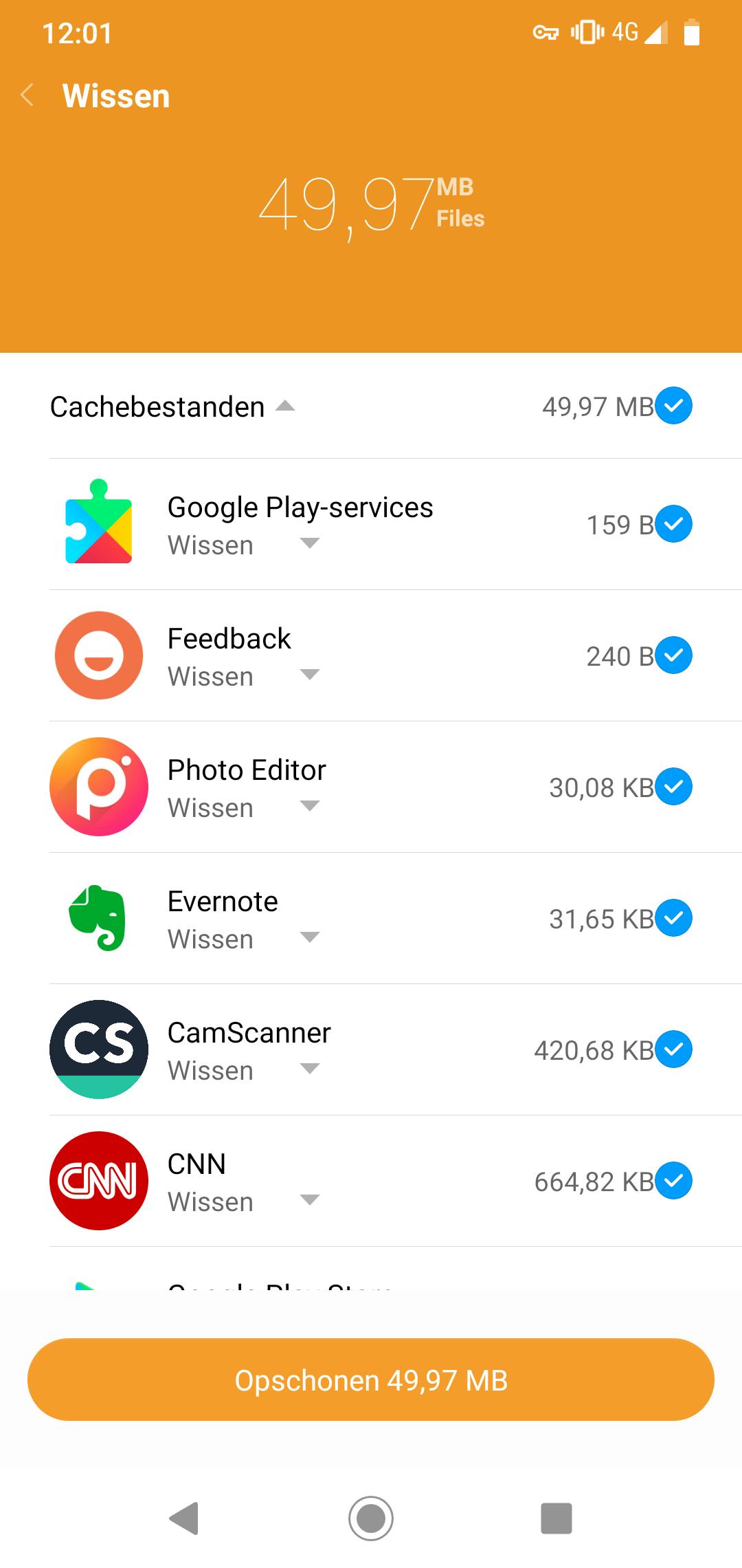 Als je echt smetvrees hebt en tijdelijke mappen van apps wilt verwijderen, dan kun je terecht bij de app Bestandsmanager. Deze vind je in je app-scherm. Als je bovenin op het map-icoontje tikt, zie je alle mappen op je Android-toestel. Hier kun je mappen vinden van apps die je allang hebt verwijderd. Houd je vinger op een map gedrukt en kies voor Verwijder, bevestig de actie en de map is weg. Kijk wel uit dat je geen noodzakelijke mappen verwijdert, anders kan je systeem in de war raken. Je kunt vanuit deze app ook automatisch alle cachebestanden van apps op je systeem verwijderen. Tik op het schoonmaak-icoontje links bovenin en kies voor Opschonen. Alle apps worden standaard geselecteerd, tik op Opschonen om de caches te verwijderen. Onder App-gegevens kun je vervolgens ook nog downloads van bijvoorbeeld Netflix of Spotify verwijderen. Tik op een app en selecteer bijvoorbeeld Downloaded Video of Downloaded songs en tik op Verwijder geselecteerde gegevens.