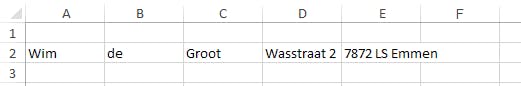 5. Noteer in E2 je postcode met je woonplaats. Wil je die twee liever apart noteren, typ dan je postcode in E2 en je woonplaats in F2.