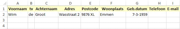 Daarnaast kun je nog je telefoonnummer typen, de geboortedatum en wat je verder wilt bijhouden. Gebruik voor elk onderdeel een eigen cel in de rij.
