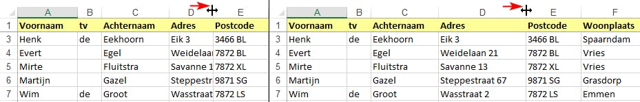 Ditzelfde kan ook via een dubbele muisklik: ga weer met de muis op de scheidslijn tussen de kolomletters gaat staan (in ons voorbeeld tussen D en E). Je muisaanwijzer heeft nu twee pijlen opzij. Als je nu dubbelklikt, wordt de kolom ook automatisch aan de breedte van de tekst aangepast.