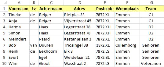 Excel doet de rest van het werk: je lijst staat nu gesorteerd op achternaam, en per achternaam staan de mensen op voornaam gesorteerd.