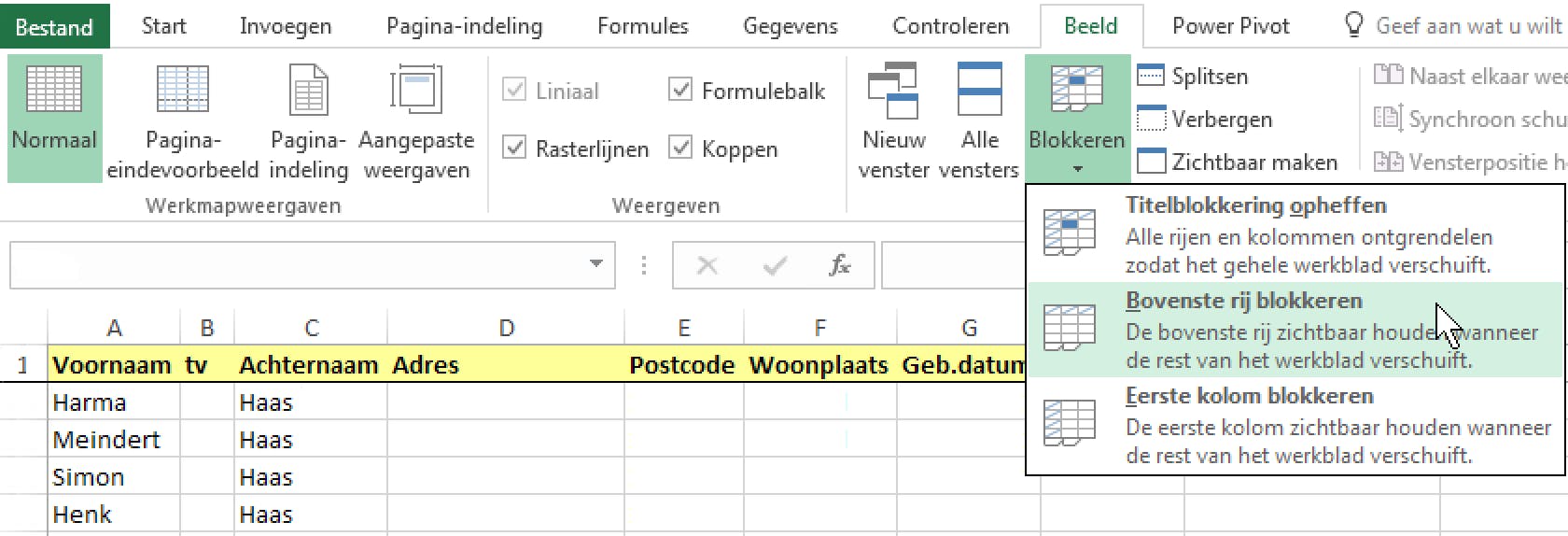 De lijst met gegevens kan natuurlijk zo lang worden dat deze niet meer in zijn geheel in beeld past. Scrol je omlaag, dan schuiven de bovenste rijen omhoog, waardoor de rij met de koppen uit beeld verdwijnt. In Excel kun je de bovenste rij vastzetten, dat doe je als volgt: