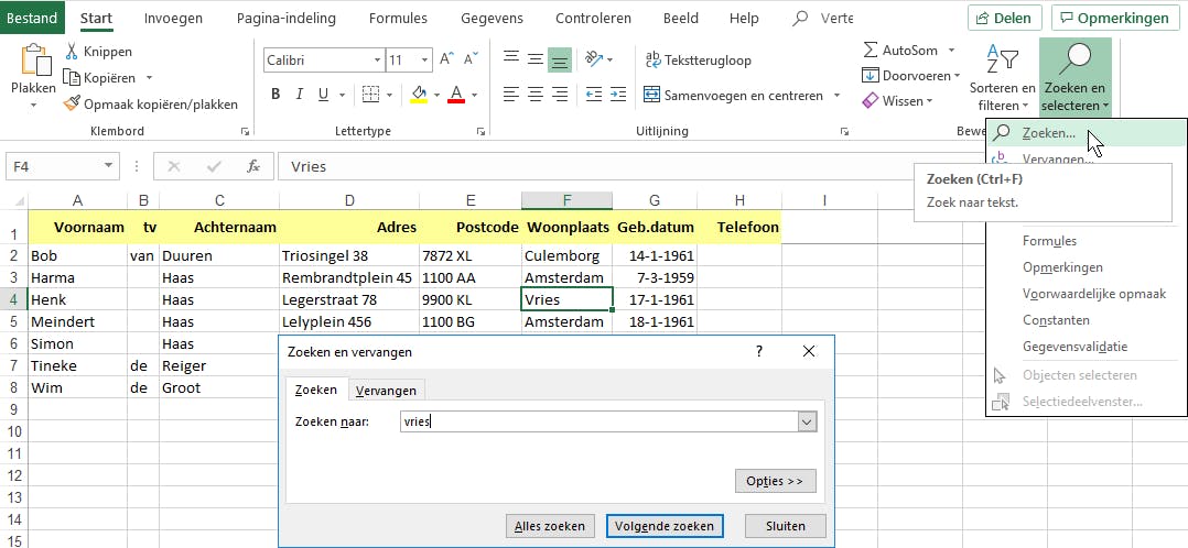 Zoek je in de adreslijst naar een bepaalde naam, laat Excel dan voor je zoeken.