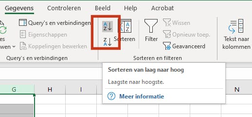 In principe hoef je de lijst niet te selecteren voordat je deze sorteert. Excel selecteert dan zelf de cellen voor de sorteeractie, door te kijken welke aaneengesloten cellen gevuld zijn. Maar als er een lege kolom of lege rij in je lijst staat, selecteer dan voor de zekerheid eerst alle kolommen en voer daarna de sorteeractie uit.
