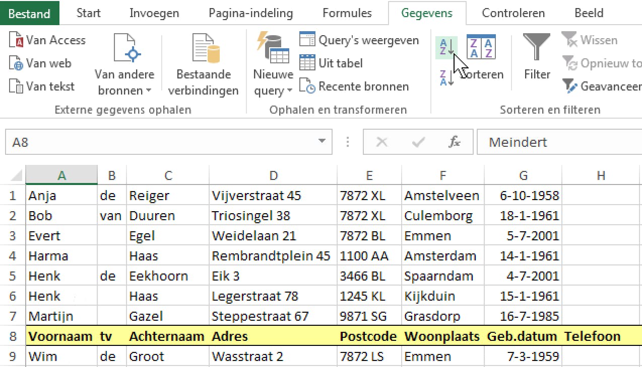 Handig in Excel is dat je lijsten waarmee je werkt ook kunt sorteren. Dat kan in de volgorde die je zelf wilt. Je geeft op welke gegevens je wilt sorteren. In het voorbeeld dat we gebruiken – de adreslijst – kun je bijvoorbeeld sorteren op de achternaam en daarbij aangeven op welke volgorde je dat wilt doen. Dat kan met de sorteerknoppen onder het Lint bij Gegevens.
