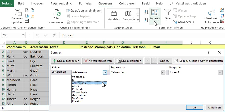 Staan alle achternamen eenmaal op alfabetische volgorde onder elkaar? Je kunt er ook voor zorgen dat vervolgens alle mensen met dezelfde achternaam op hun voornamen gesorteerd worden.