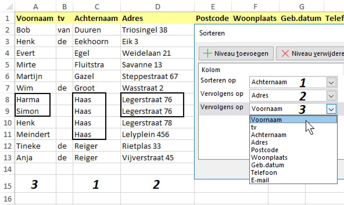Je kunt de adreslijst nog nauwkeuriger sorteren. Je sorteert bijvoorbeeld eerst alle achternamen op alfabetische volgorde en sorteert de mensen met dezelfde achternaam vervolgens op adres: die horen meestal bij hetzelfde gezin en staan dan bij elkaar. Vervolgens sorteer je de leden van hetzelfde gezin op voornaam.