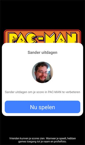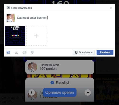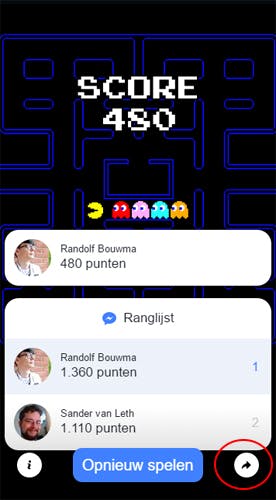 In Pac-Man eindigt het spel bijvoorbeeld als je door een spookje wordt geraakt, in Space Invaders zodra je wordt neergeschoten door een alien. Je hebt tot slot ook nog de mogelijkheid om je score met al je Facebook-vrienden te delen, door op het pijltje te tikken. Desgewenst schrijf je er in het volgende venster nog een persoonlijk berichtje bij, en druk je op Plaatsen.
