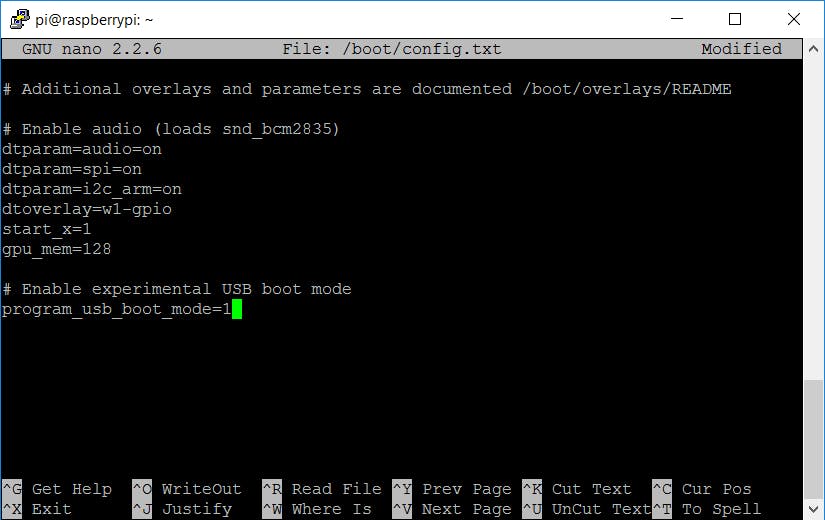 Open het opstartconfiguratiebestand met sudo nano /boot/config.txt en voeg de opdracht program_usb_boot_mode=1 toe aan het einde. Sla het bestand op met Ctrl+O en sluit nano af met Ctrl+X. Herstart je Pi met sudo reboot, en controleer na de herstart of de usb-modus is ingeschakeld. Dat doe je met de opdracht vcgencmd otp_dump | grep 17:, die als resultaat een getal moet tonen dat eindigt op 0x3020000a. Open daarna weer het opstartconfiguratiebestand en verwijder de opdracht program_usb_boot_mode=1, zodat je niet per ongeluk de usb-bootmodus inschakelt op een andere Pi waarin je deze sd-kaart steekt.