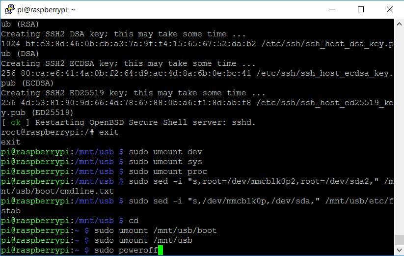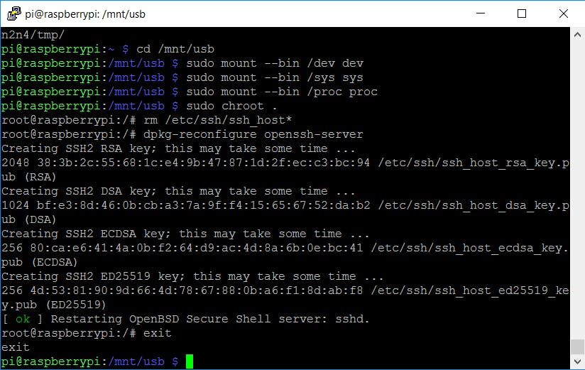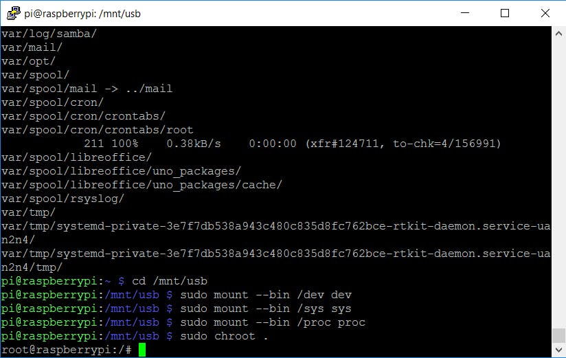 De usb-opslag bevat nu een kopie van je draaiende Raspbian, maar niet alles mag identiek zijn. Zo heeft het nieuwe systeem andere ssh-sleutels nodig. Ga daarom naar de usb-opslag met cd /mnt/usb en koppel een aantal speciale bestandssystemen aan met sudo mount --bind /dev dev, sudo mount --bind /sys sys en sudo mount --bind /proc proc. Voer daarna een chroot (change root) uit met sudo chroot .. Alle opdrachten die je nu uitvoert, worden in het systeem op de usb-opslag uitgevoerd, niet meer in het systeem op de sd-kaart.