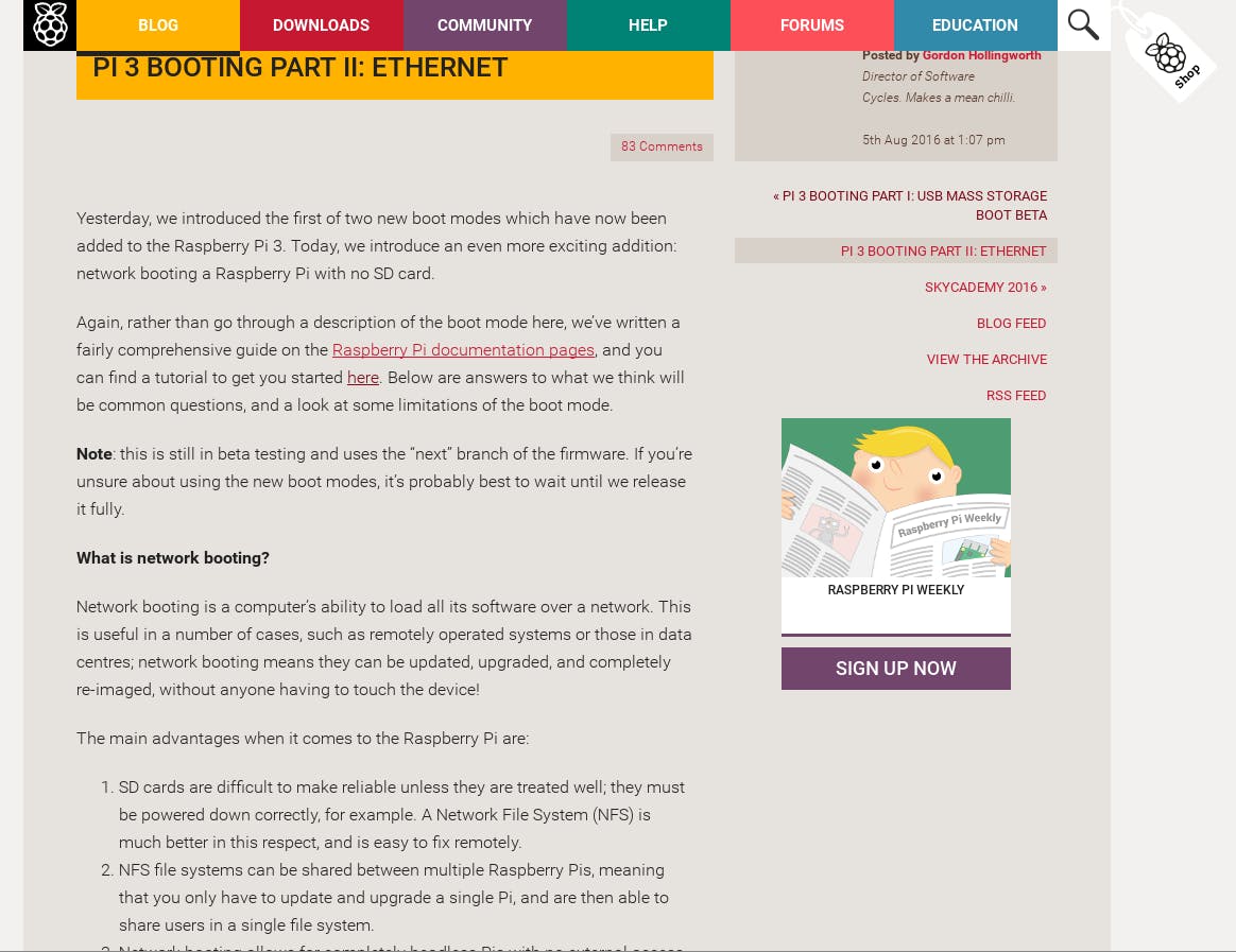 Voor opstarten vanaf het netwerk is er een belangrijke beperking: dit werkt niet vanaf wifi, alleen vanaf de ingebouwde ethernetpoort. Maar sommige switches zijn te traag met hun reactie op de dhcp-aanvraag van de bootcode van de Pi. Bovendien duurt het soms lang voor de bootcode van een time-out is hersteld. Hoe meer computers er op je netwerk hangen, hoe sneller de Pi ontwaakt door een willekeurig netwerkpakket. Verder geldt hetzelfde als bij usb: je moet eerst je firmware upgraden. En op een Raspberry Pi 1, 2 of Zero kun je experimentele bootcode op de sd-kaart installeren.