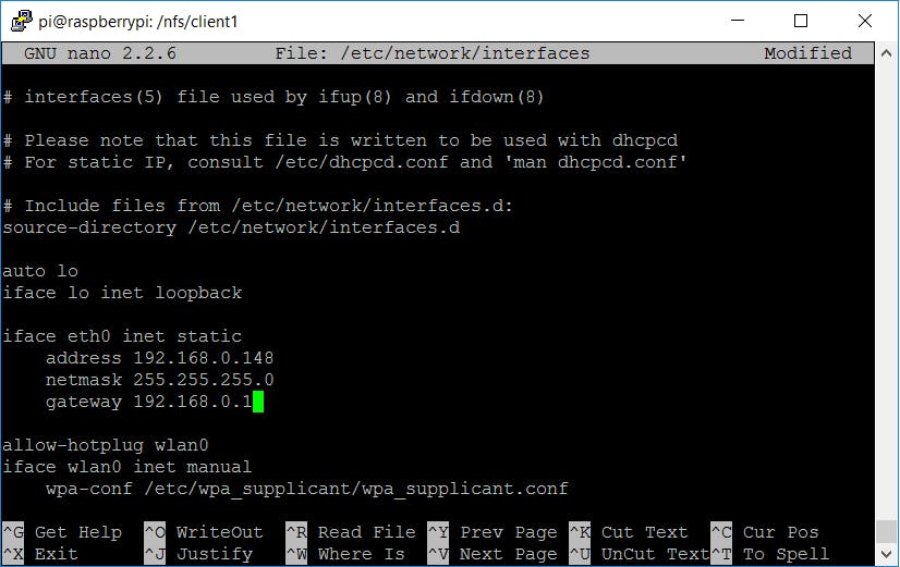 Voer daarna stap 7 uit, maar met cd /nfs/client1 in plaats van cd /mnt/usb. Voer daarna stap 8 uit, maar voordat je de chroot verlaat, typ je nano /etc/rc.local en voeg je voor de regel met exit 0 de regel /etc/init.d/ssh start toe. Vraag daarna (als je de chroot hebt verlaten) het adres van je gateway op met ip route | grep default | awk '{print $3}' en voer ip -4 addr show dev eth0 | grep inet uit. Na inet krijg je het ip-adres van je server te zien en na brd het broadcastadres van je netwerk.