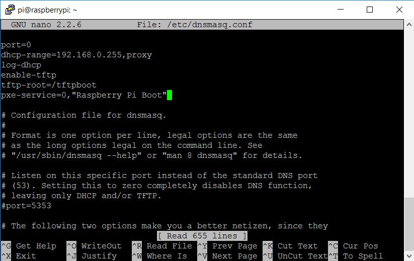 Installeer daarna een dhcp-server: sudo apt-get install dnsmasq. Voer dan sudo rm /etc/resolvconf/update.d/dnsmasq uit. Nu moeten we ervoor zorgen dat de dhcp-server het bestandssysteem aan de clients doorstuurt. Voer sudo nano /etc/dnsmasq.conf uit en voeg de volgende regels bovenaan het bestand toe: port=0, dhcp-range=BROADCAST,proxy (met in plaats van BROADCAST je broadcastadres), log-dhcp, enable-tftp, tftp-root=/tftpboot en pxe-service=0, Raspberry Pi Boot". Sla het bestand op met Ctrl+O en sluit nano af met Ctrl+X. Maak de tftp-directory aan met sudo mkdir /tftpboot en geef die de juiste gebruikersrechten met sudo chmod 777 /tftpboot. Schakel dnsmasq in met sudo systemctl enable dnsmasq.