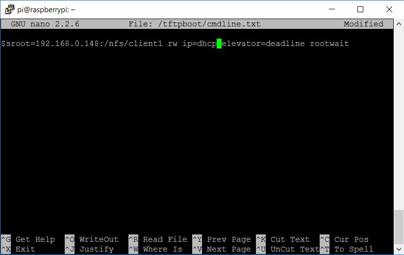 Kopieer het bootbestandssysteem met cp -r /boot/* /tftpboot. Het rootbestandssysteem hebben we eerder al gekopieerd, maar moeten we nog beschikbaar stellen. Installeer een nfs-server met sudo apt-get install nfs-kernel-server. Exporteer nu het rootbestandssysteem met echo "/nfs/client1 *(rw,sync,no_subtree_check,no_root_squash)" | sudo tee -a /etc/exports. Activeer en herstart rpcbind met sudo systemctl enable rpcbind en sudo systemctl restart rpcbind en doe hetzelfde met de nfs-server: sudo systemctl enable nfs-kernel-server en sudo systemctl restart nfs-kernel-server. Voer dan nano /tftpboot/cmdline.txt uit en vervang de configuratie vanaf root= door root=/dev/nfs nfsroot=IPADRES:/nfs/client1 rw ip=dhcp elevator=deadline rootwait.