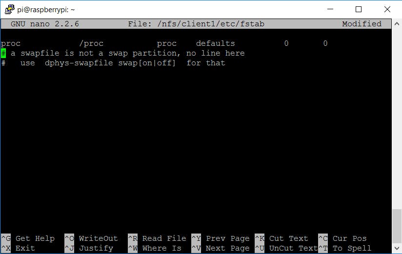 Voer nu sudo nano /nfs/client1/etc/fstab uit en verwijder de regels met /dev/mmcblkp1 en /dev/mmcblkp2. Alleen de regel met het proc-bestandssysteem mag blijven staan. Sla je wijzigingen op met Ctrl+O en sluit nano af met Ctrl+X. Herstart je server met sudo reboot. Zodra dat is gebeurd, verbind je de client met het netwerk en sluit je de stroomkabel aan. Na ongeveer tien seconden zouden de ledjes op het bordje moeten aangaan. Als alles goed gaat, start je Pi nu op van de kernel in /tftpboot op je server en koppelt die daarna ook het bestandssysteem in /nfs/client1 op je server aan.