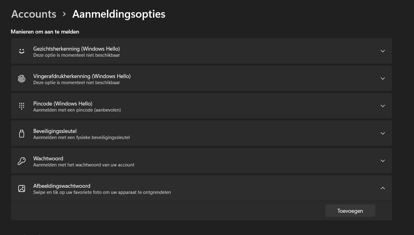 Om een afbeeldingswachtwoord in te stellen, open je met Windows-toets+I het instellingenvenster van Windows en ga je naar Accounts / Aanmeldingsopties.