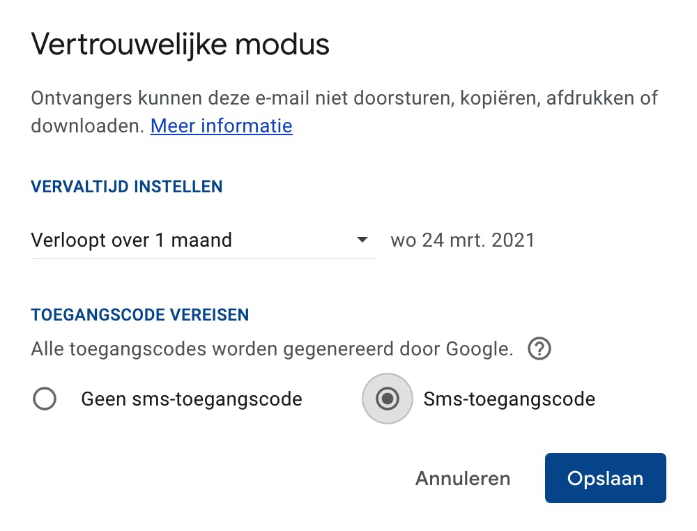 In het pop-upvenster Vertrouwelijke modus lees je dat de ontvanger dit bericht nooit kan doorsturen, kopiëren, afdrukken of downloaden. Dat is de eerste veiligheidslaag. Bovendien kun je hier een vervaldag instellen. Je hebt de keuze tussen na één dag, een week, een maand, drie maanden en vijf jaar. Bovendien is het mogelijk een toegangscode te eisen. Zonder deze code krijgt niemand het bericht open. Wanneer je hier SMS-toegangscode aanduidt, ontvangt de persoon van wie je het telefoonnummer ingeeft het wachtwoord per sms. Klik op Opslaan als je klaar bent. Op dat moment verschijnt onderaan het bericht een melding in het blauw die aangeeft dat de inhoud zal verlopen op de aangeduide dag. Klik op Verzenden om de e-mail te versturen.